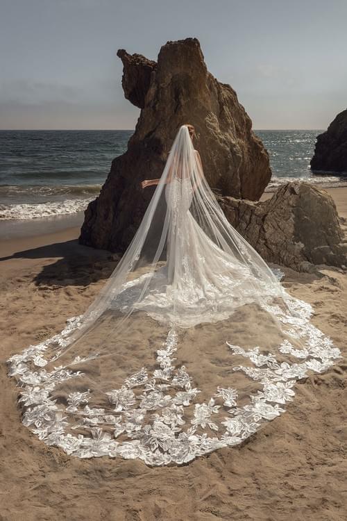 雙層不對稱的半拖地 (Semi-Cathedral) 裙襬凸顯了獨特蕾絲的美感。