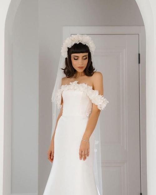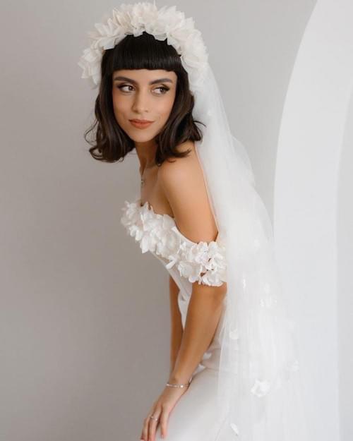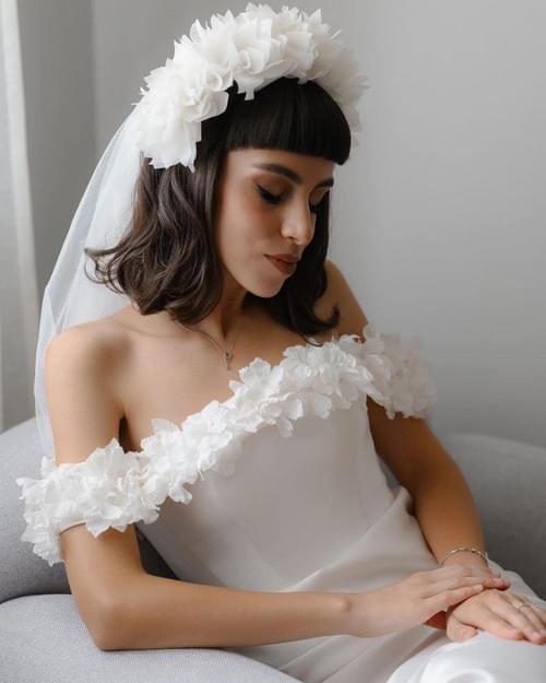 飾有手工製作的立體花朵、柔軟的網紗垂墜、亮片、水晶和珠飾。