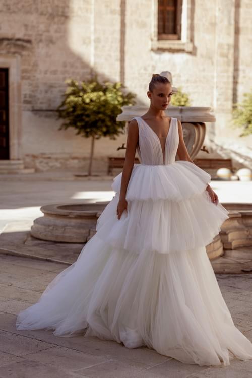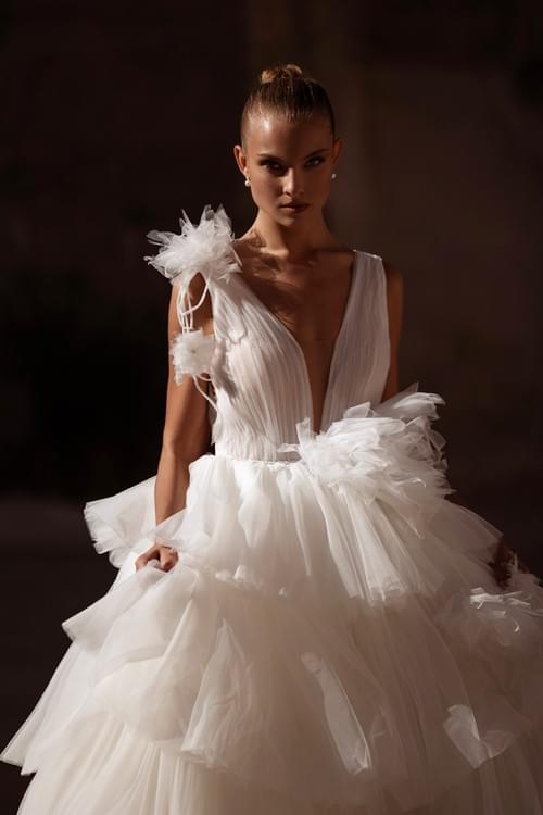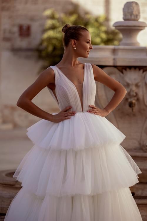 裙襬部分是其主要特色,由數層精緻的薄紗層疊而成,形成豐滿飄逸的 A 字型輪廓。