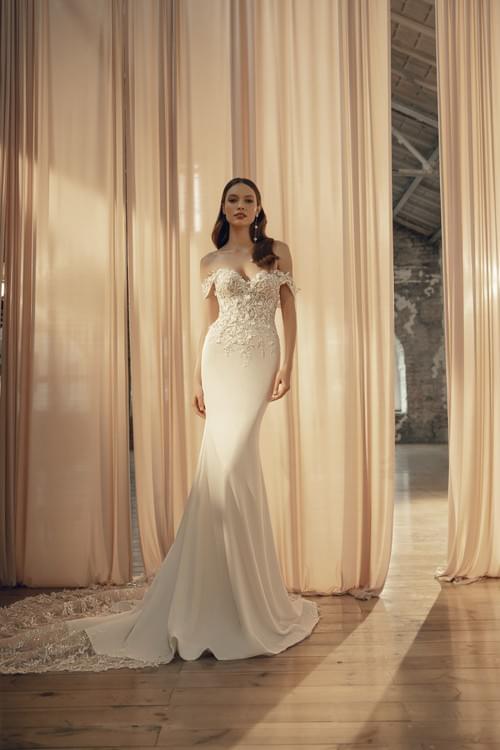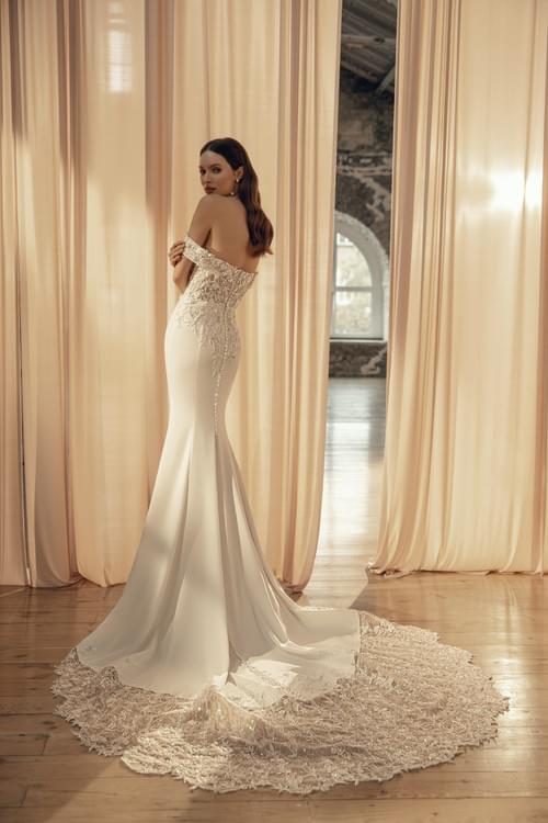 光滑的縐紗 (crepe) 材質勾勒出新娘的身體曲線,並在膝蓋處展開成喇叭形的裙襬,最後以一個長拖尾 (long train) 完美收尾。