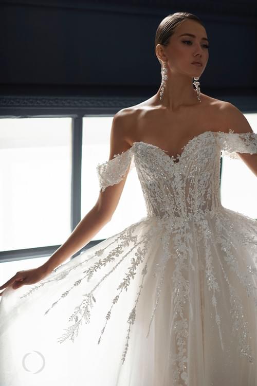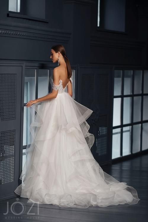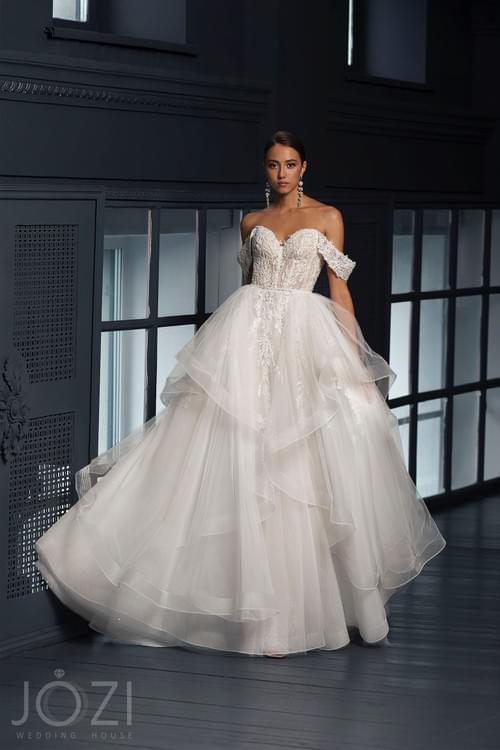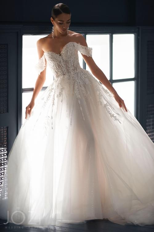 Jozi Anael婚紗是一款經典的 A 字型 設計,以其半透明心形緊身胸衣和露肩短袖為特色。