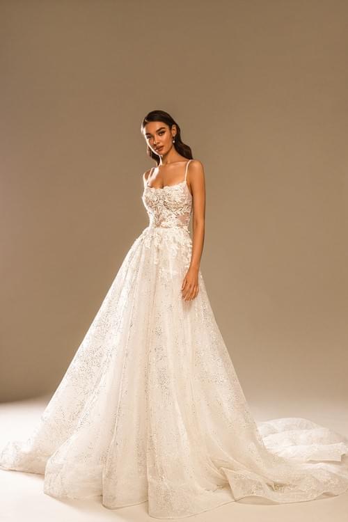 採用閃閃發光的薄紗製成,是一款令人驚嘆的 A 字形禮服。