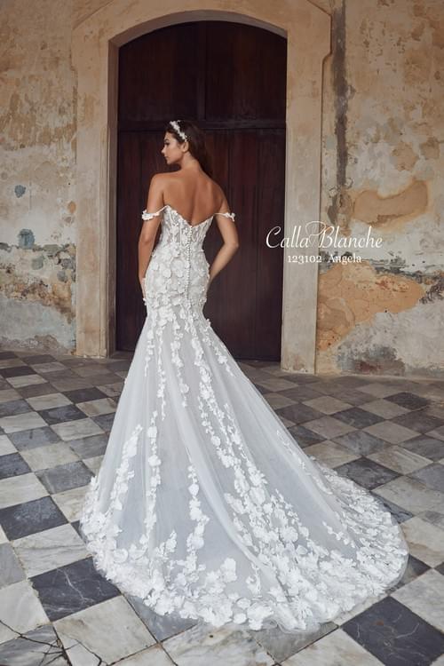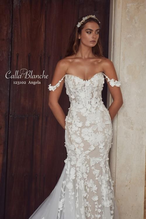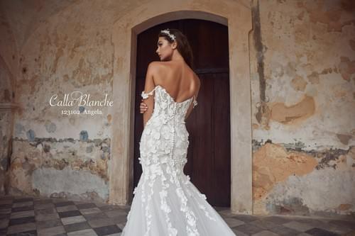 Calla Blanche 的 Angela 一款性感的美人魚(魚尾)婚紗,採用了引人注目的 3D 立體花卉蕾絲設計。