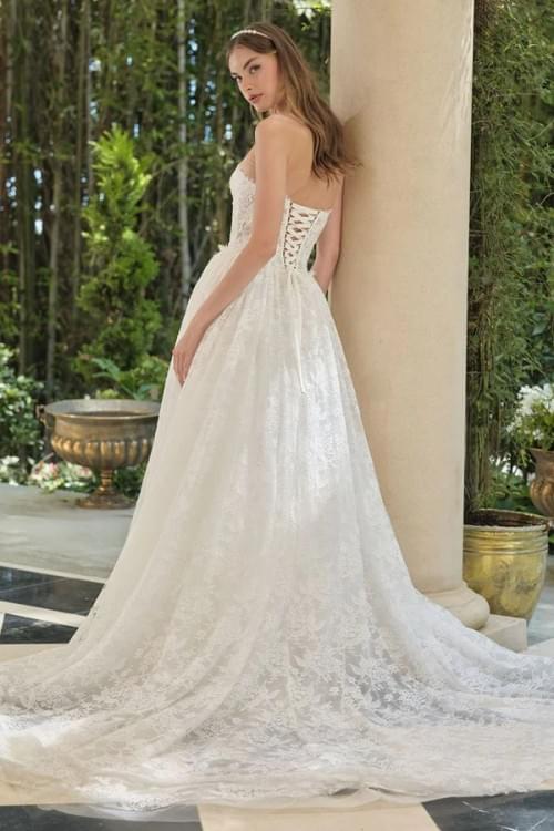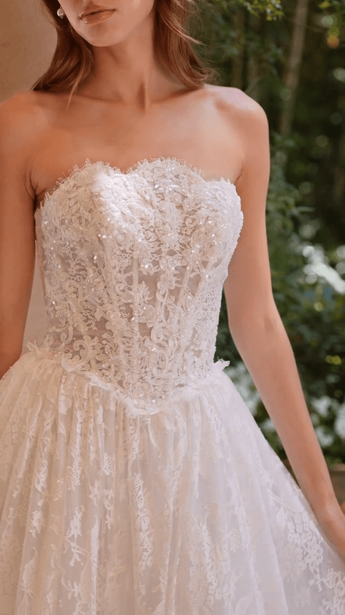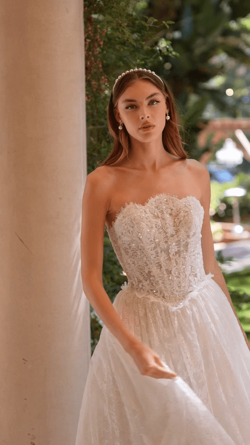 由 Andrea and Leo 設計的 WL061 又稱Antheia,展現了經典浪漫的公主風格。它採用精緻的全蕾絲刺繡,結合平口抹胸與優雅的心形領設計,上身透過帶有魚骨支撐的馬甲(Corset)與美背繫帶,完美勾勒出纖細的腰部線條;下半身則由豐盈的 A 字型裙擺延伸出華麗的長拖尾,營造出既典雅又夢幻的視覺效果。