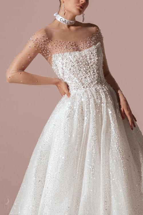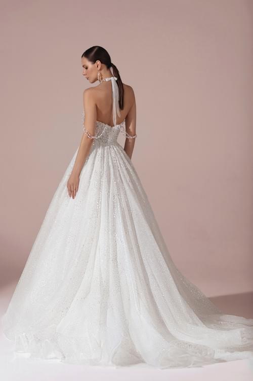 Gabbiano 品牌 Premium Lux 2025系列中的 Artemida,閃亮 A 字型婚紗採用露背繞頸設計和長裙襬。緊身胸衣飾有串珠和亮片刺繡,與閃閃發光的薄紗裙襬完美融合,結合了閃光薄紗和精緻的珠飾,形成優雅的繞頸領口和夢幻般的舞會禮服廓形。