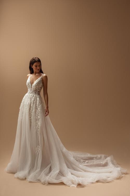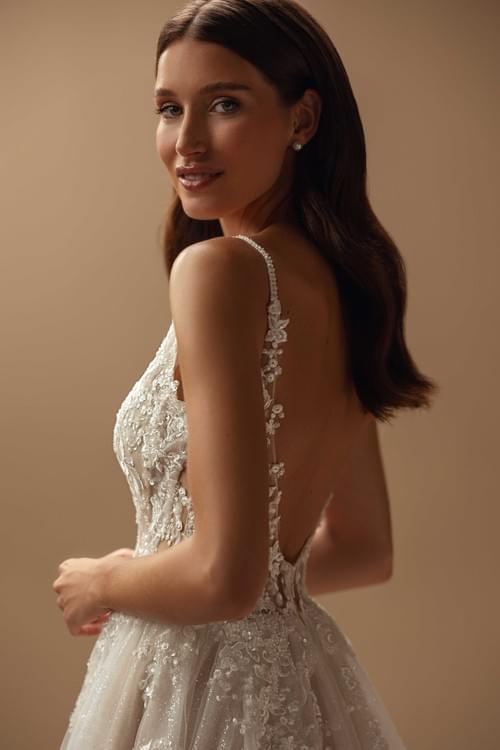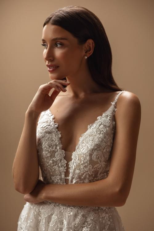 緊身胸衣採用深 V 領和手工縫製的蕾絲貼花強調,並一直延伸到裙襬。