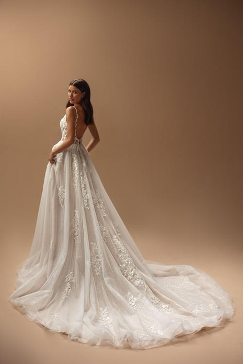 它還設有一個低開的露背設計和一個華麗的長拖尾。