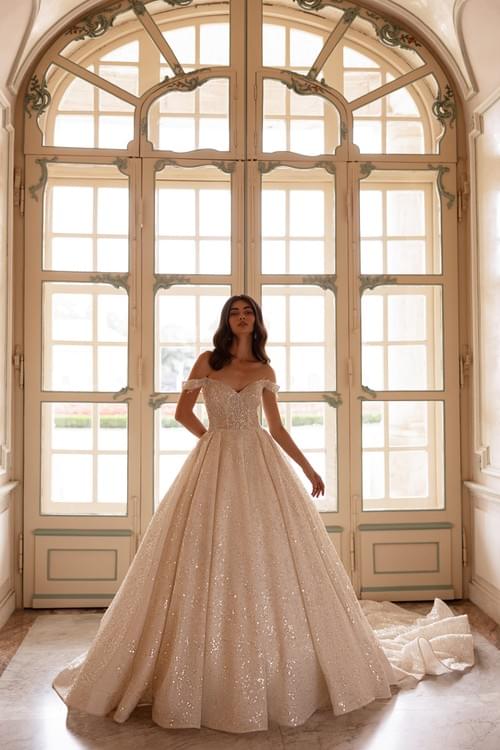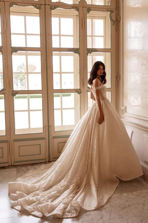 閃閃發光的一字肩婚紗是 Atelier Barbara Langellotti 的 Bria 款式,屬於公主風長婚紗。它採用 V 領和落肩(一字肩)設計,並配有束身衣式(corset)的閉合系統。