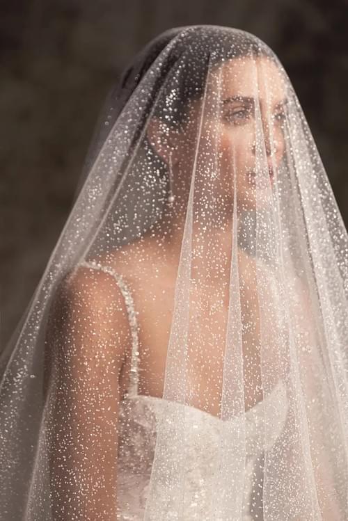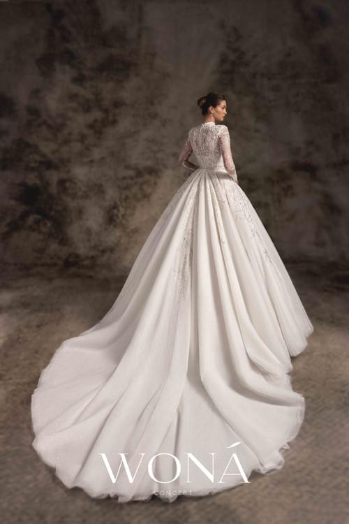 設有高領和長袖,裙身有華麗的拖尾。它甚至配有可拆卸的短上衣(bolero),為新娘提供多種造型選擇。