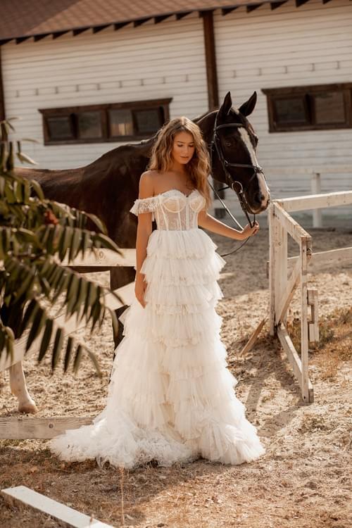 Dominiss的Camellia婚紗採用迷人的 A 字廓形,配有浪漫的心形領口和露肩設計。
