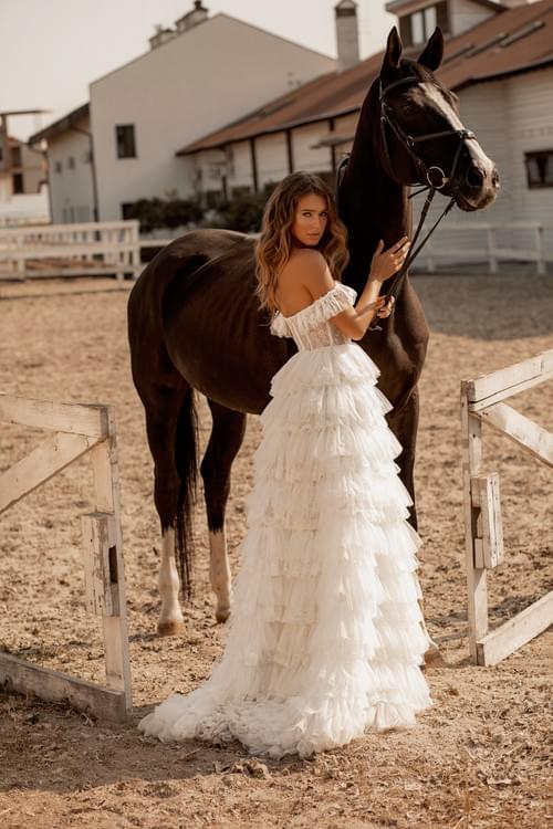 裙身由多層優質薄紗層疊而成,形成夢幻般的荷葉邊效果,為整體造型增添了動感和柔美氣息。