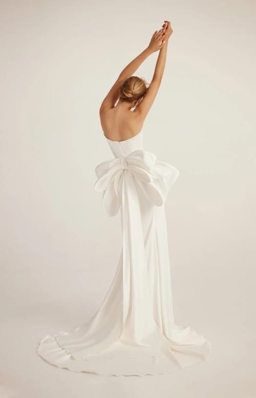 華麗誇張的背部裝飾: 背面設計是一大亮點,裝飾有巨型緞面蝴蝶結。這不僅打破了正面的極簡感,更為新娘在轉身或進場時增添了強烈的視覺衝擊力與戲劇效果。
