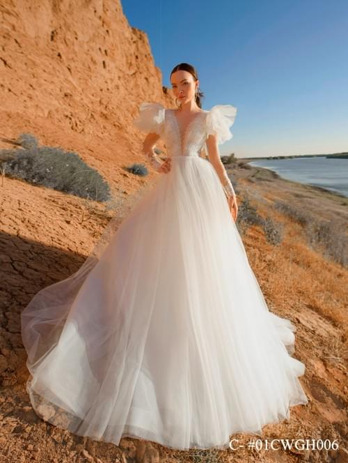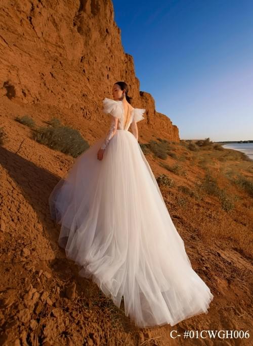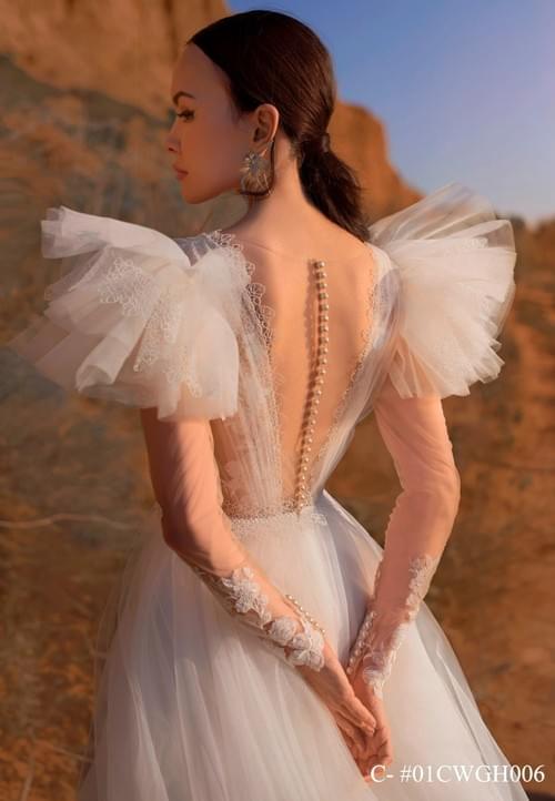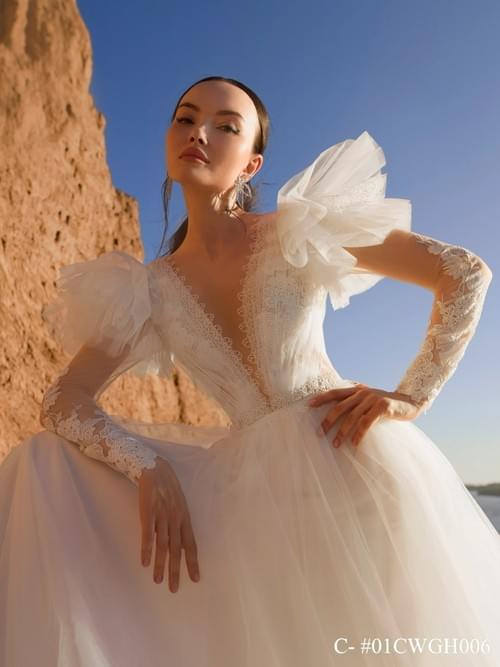 設計特點包括深 V 領口、錯覺長袖以及肩部的荷葉邊飾,整體風格優雅、時尚且浪漫,適合尋求獨特而精緻外觀的新娘。