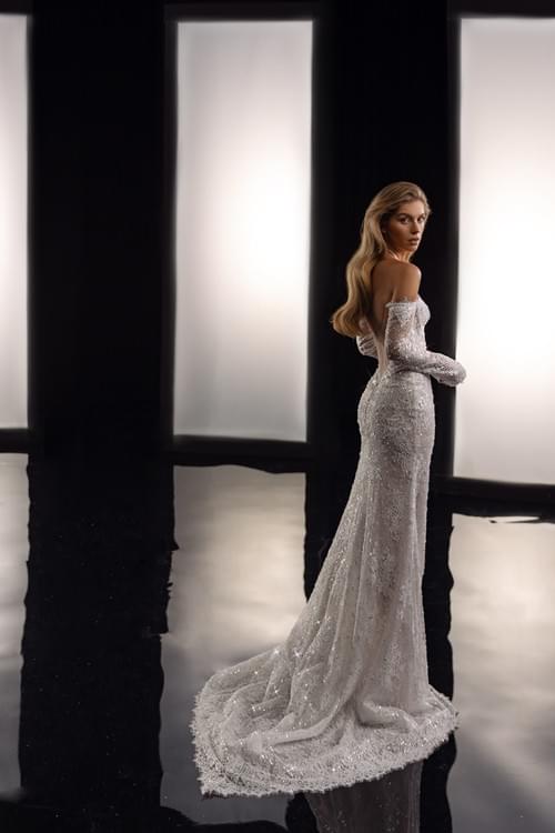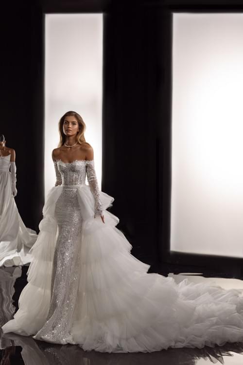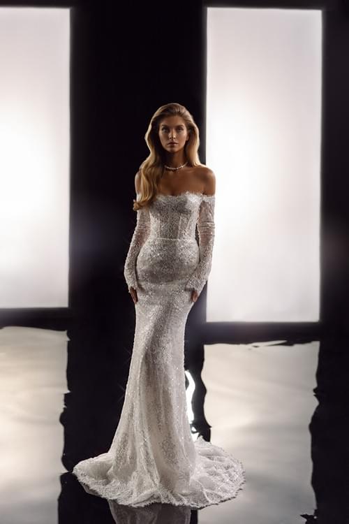 採用露肩設計和長袖,飾有精緻的蕾絲和閃光細節,並配有心形緊身胸衣。