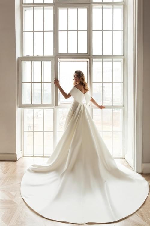 這款 Eva Lendel "Dana" 婚紗出自 Less is More 2021 系列,採用極簡主義的 Mikado 緞面打造優雅的 A-line 廓形。