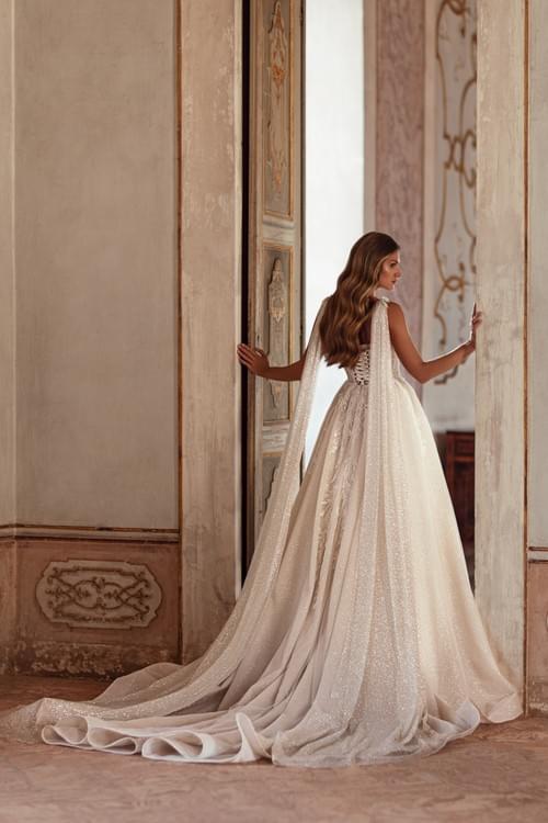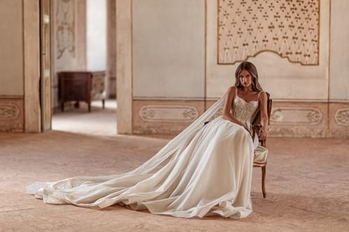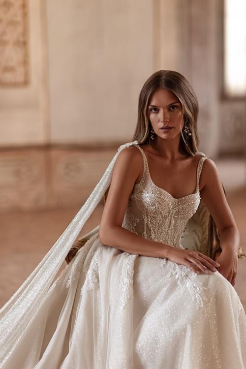 緊身胸衣上飾有珠飾和亮片蕾絲貼花,裙擺由輕盈的薄紗或緞面製成,營造出閃閃發光的效果。