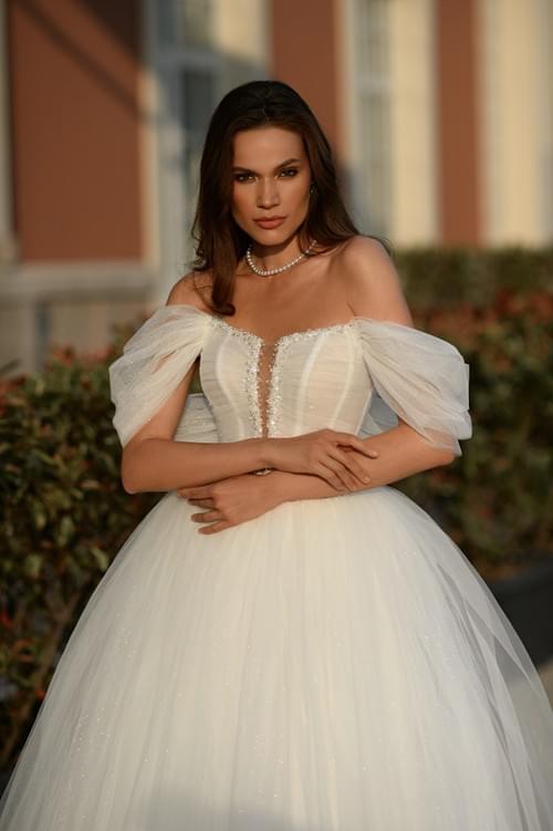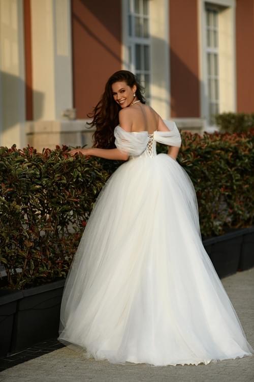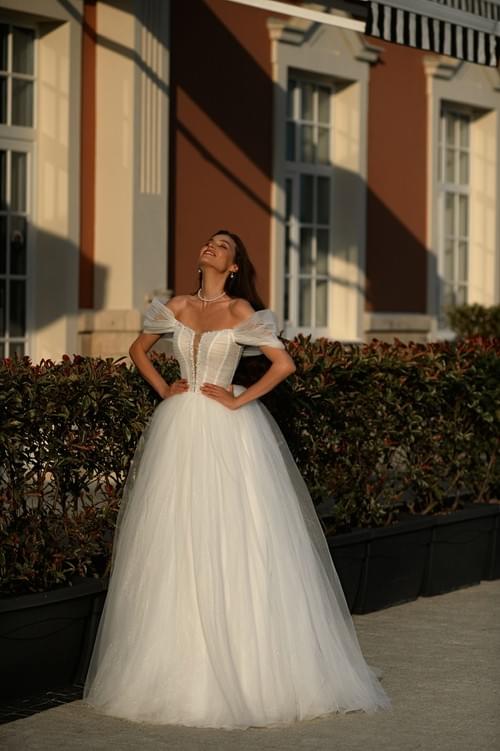 以其輕盈、柔和的視覺效果而聞名,閃光歐根紗和裝飾在胸衣上的細節在陽光或燈光下會增添節日氣息。