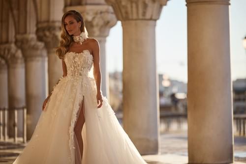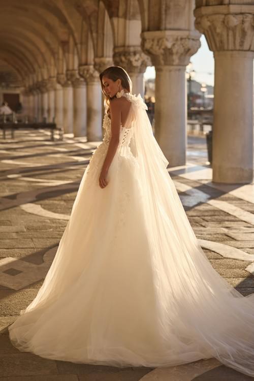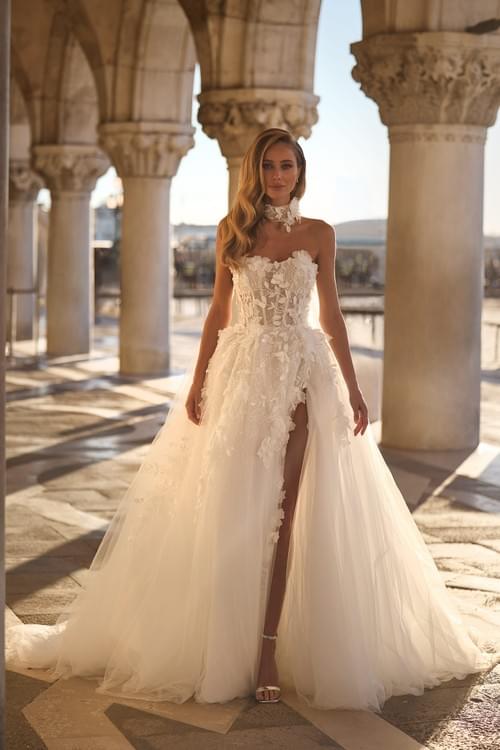 抹胸心形領口、結構化馬甲式上衣、3D 立體花朵蕾絲貼花和閃光薄紗裙身。