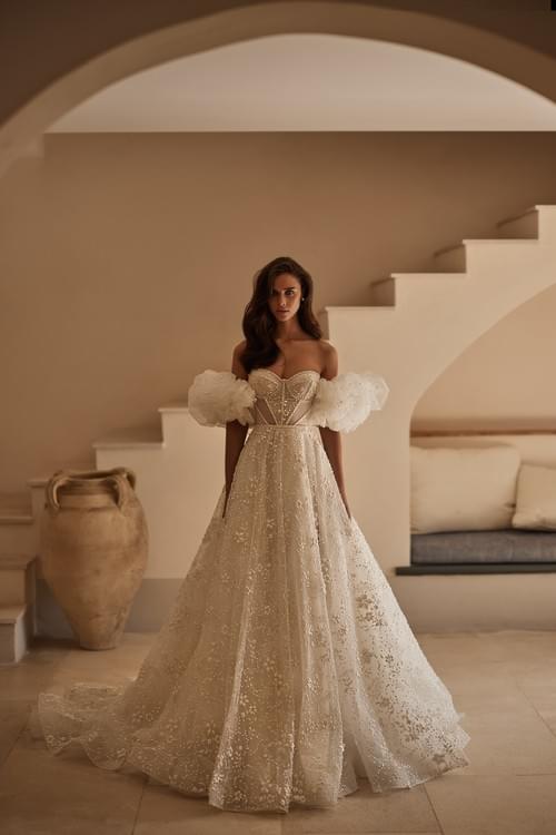 A字形輪廓,結構化的緊身胸衣設計,飾有精緻的珠飾刺繡和3D花卉貼花。