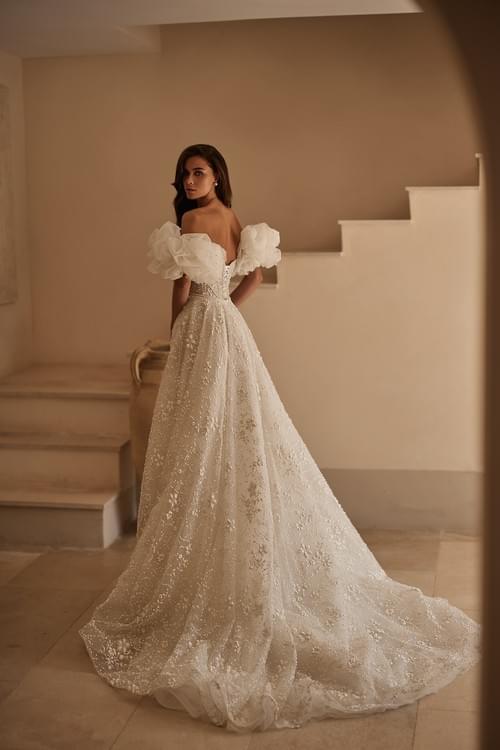 豐盈的閃光薄紗裙,帶有高開衩設計,增加現代魅力和便於活動。