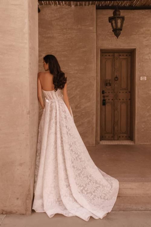 禮服本體為經典的 A-Line 剪裁,搭配深具現代感的平口魚骨緊身胸衣,展現迷人的鎖骨與腰身輪廓;全裙身覆蓋著細膩的香緹蕾絲(Chantilly Lace),並延伸出華麗的長拖尾。整件婚紗在簡約的線條中隱含複雜的工藝細節,詮釋出優雅且不失氣場的意境。