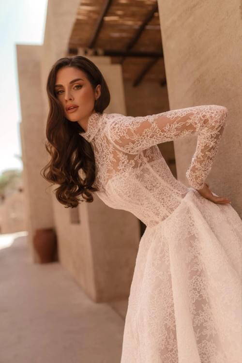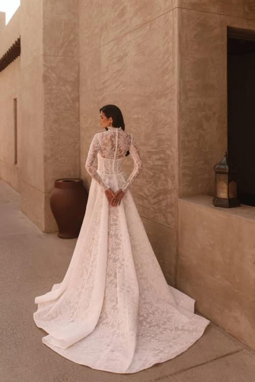 來自 Giovanna Alessandro 的 Emilia 婚紗,完美融合了復古宮廷感與現代輕奢風格。其設計精髓在於「二合一」的可拆卸蕾絲高領長袖外套,讓新娘能在莊重的教堂儀式與性感的晚宴派對間自由切換。