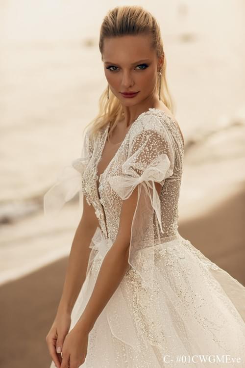 透膚設計(illusion bodice),飾有珠飾珍珠點綴的閃光薄紗,並採用 10 件魚骨和罩杯結構,提供良好支撐和舒適度。