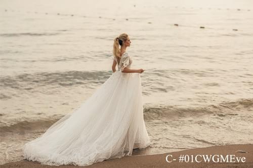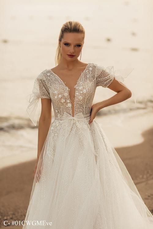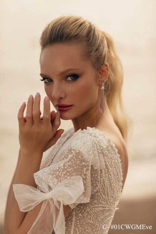 Evie Young Bridal 品牌的 Eve 款式。 經典 A 字形輪廓,內襯柔軟的夏慕絲綢(charmeuse lining),優雅地垂墜貼合身體。