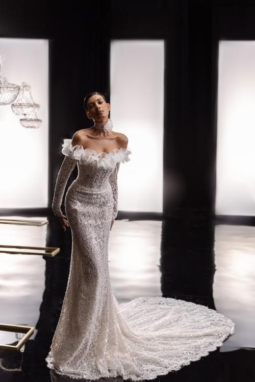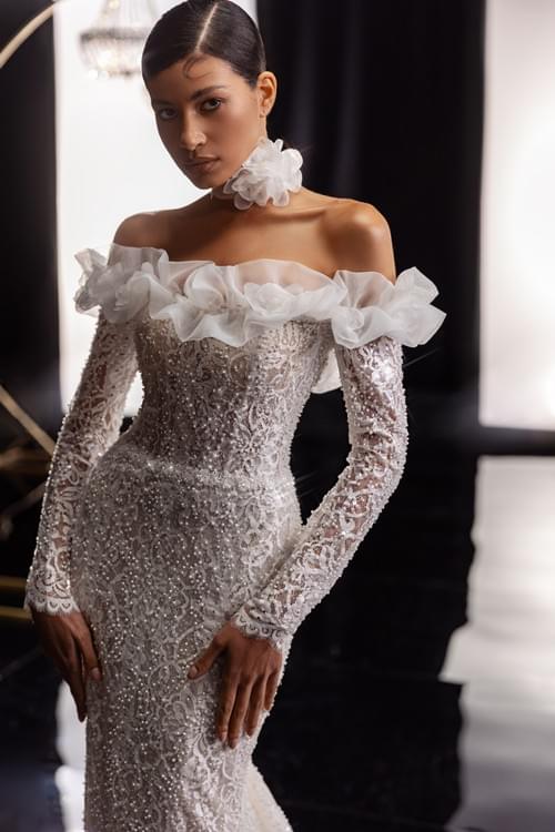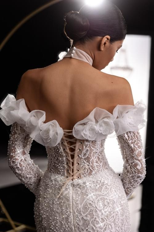 由串珠花邊(beaded lace)、閃光片(sequins)和珍珠製成,充滿 3D 花卉裝飾,並配有手工花朵裝飾的衣領(choker style neck ruffle)。