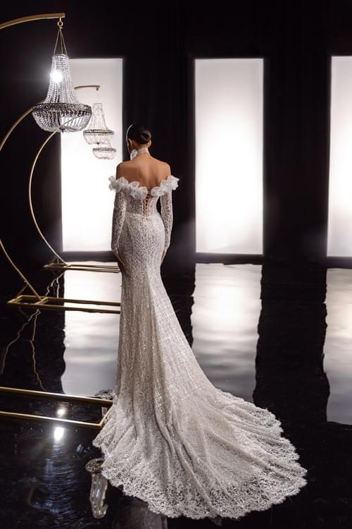 設有直領口(straight décolleté)和綁帶式馬甲背面(laced-back corset),並有長款美人魚裙襬。