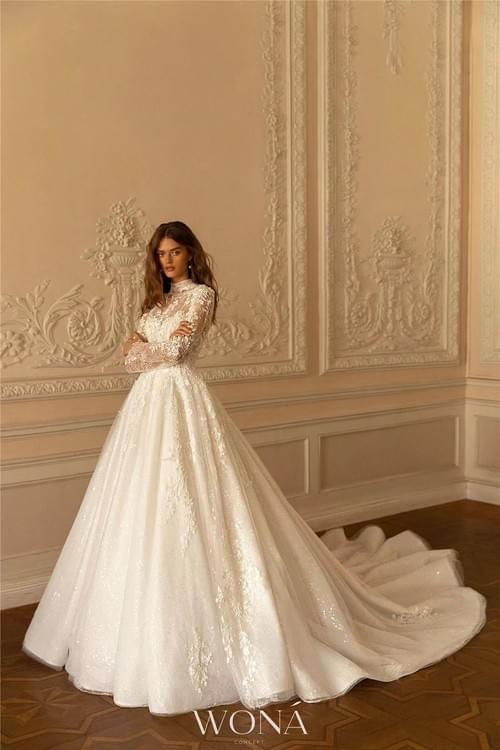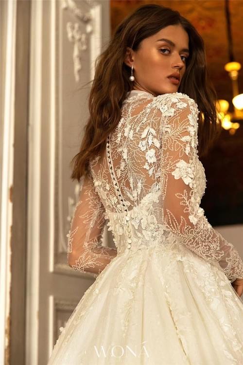採用球形禮服(Ball Gown)輪廓,結合了不同的蕾絲圖案,非常引人注目。
