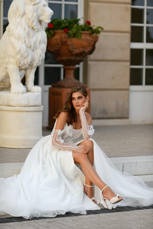 3D花卉裝飾點綴在緊身胸衣和袖子上,增添了空靈感和柔美氣息。