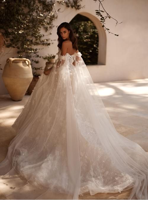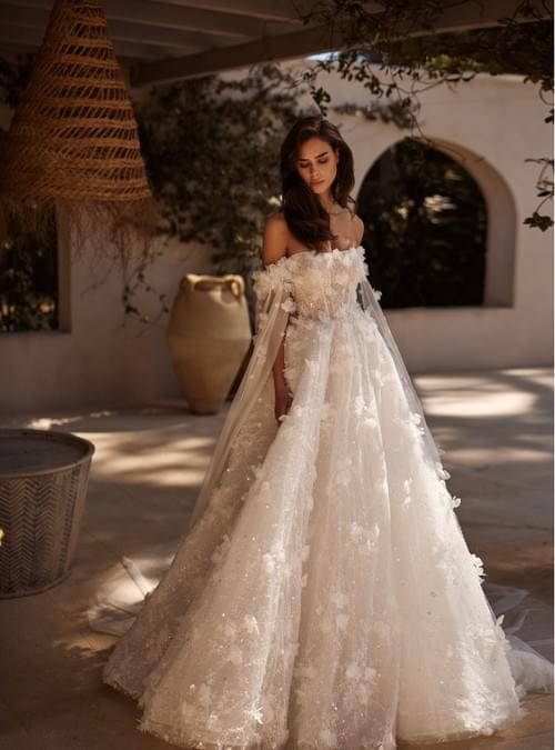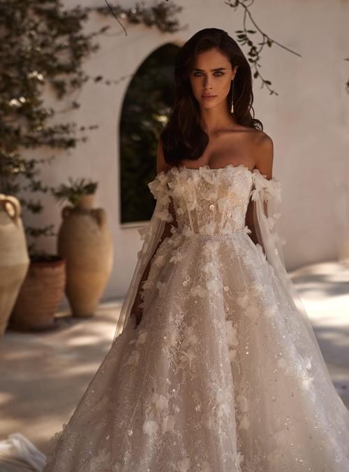 這款 Lanesta Florinda 婚紗以極致的浪漫主義為核心,採用經典的 A-line 剪裁,特別強調修飾身形比例。
