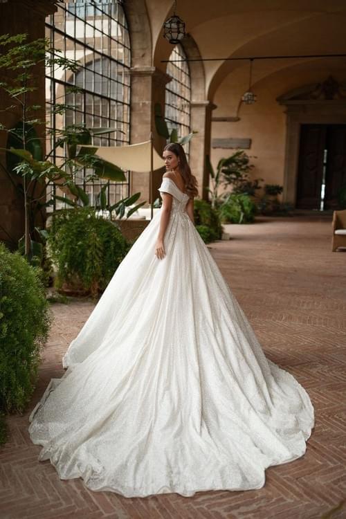 這款由 Milla Nova 設計的 Francheska 婚紗,是極致浪漫與華麗的代名詞。它採用經典的大蓬裙 (Ball Gown) 剪裁,最引人注目的是整件禮服佈滿了如星塵般的銀色閃粉與精緻亮片,讓新娘在走動間散發璀璨光芒。