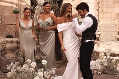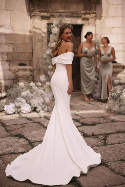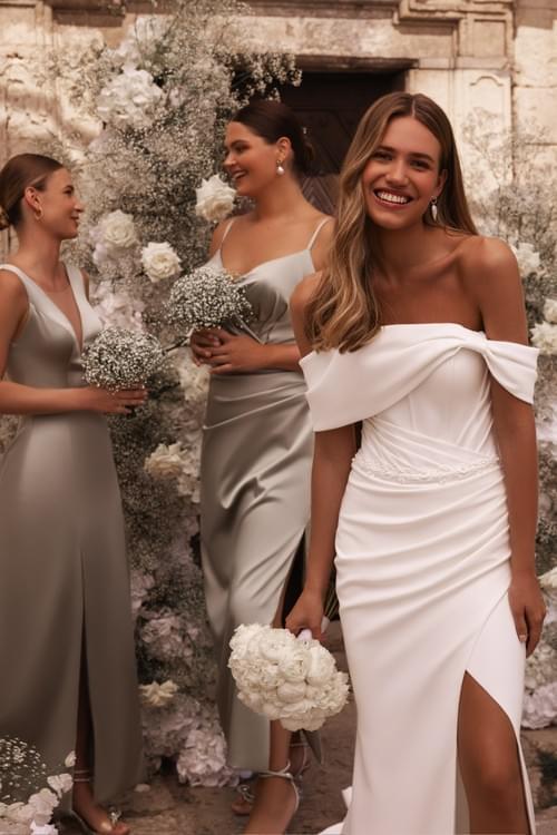 採用奢華緞面或華麗塔夫綢製成特色包括性感的露肩(一字領)設計和結構化的馬甲式上身,勾勒出身形曲線。