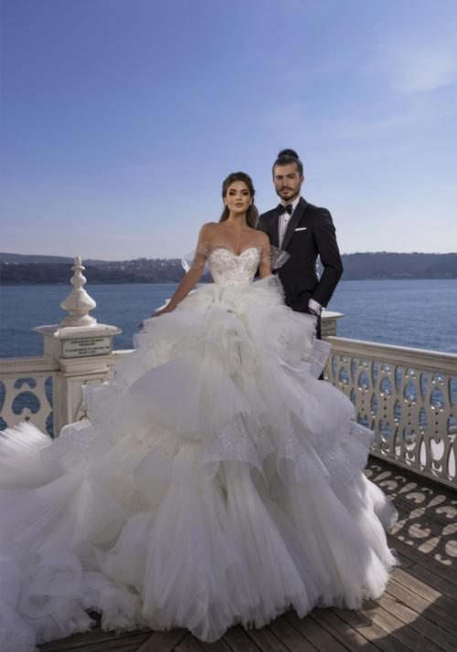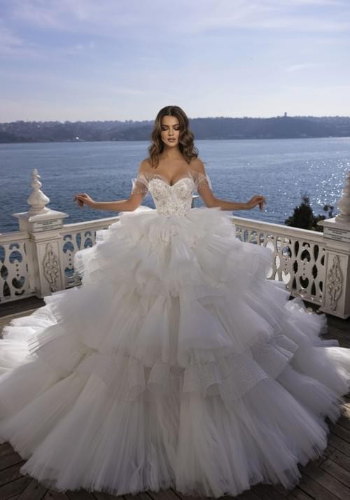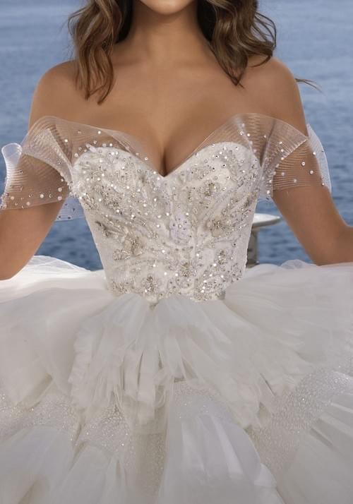 Dovita Bridal 的這款「Galaxy」婚紗是一款華麗的舞會禮服,採用露肩心形領口設計,主體由精緻的刺繡和串珠薄紗覆蓋,並以多層次的蓬鬆荷葉邊裙襬為特色,營造出戲劇性的體積感和飄逸感。