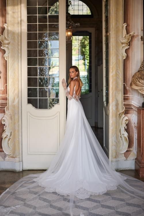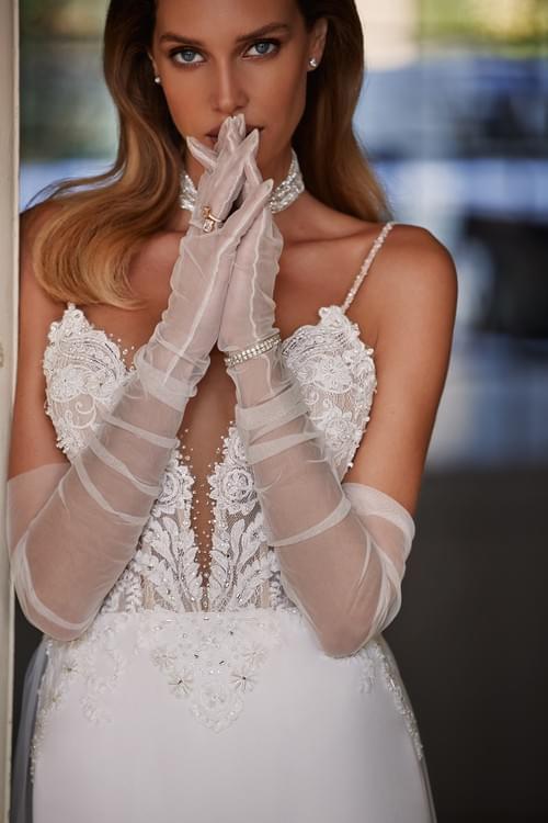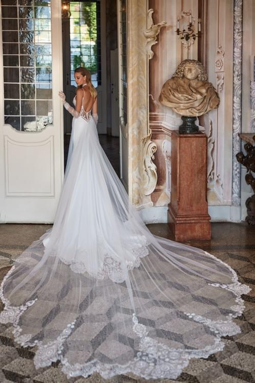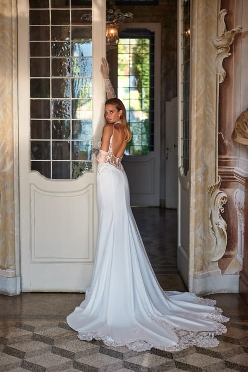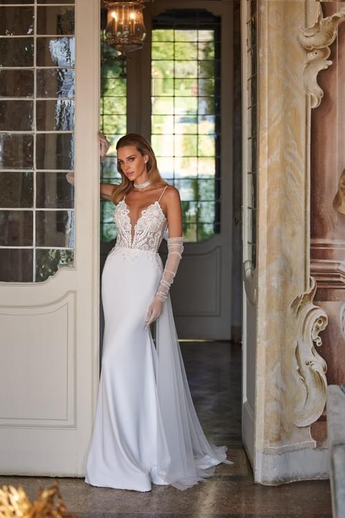 Luce Sposa 的 Ida 款式,採用美人魚剪裁和深 V 領口設計,胸衣飾有精緻的蕾絲貼花,並配有細肩帶和可拆卸的薄紗拖尾,整體風格優雅且現代。