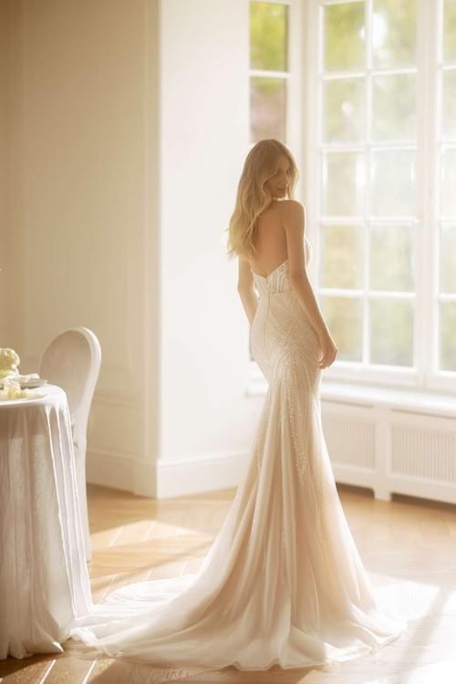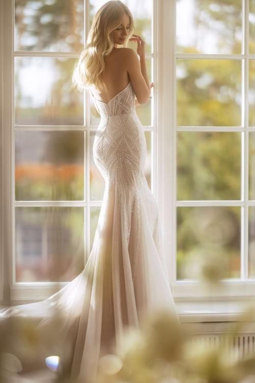 這款婚紗的特點是遍佈精緻的珠飾貼花和閃亮的薄紗,營造出輕盈、優雅且閃耀的效果。
