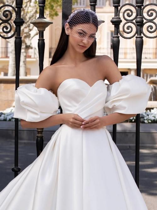 其設計核心在於一紗兩穿的靈活性,配備一對顯眼的立體泡泡袖,戴上時充滿時尚前衛的浪漫感,拆下後則變為純淨簡約的經典抹胸造型。