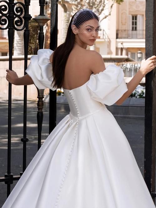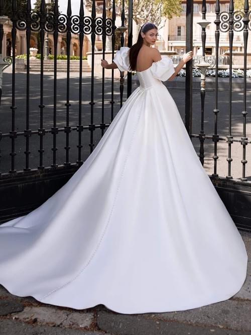 Pronovias的Ixion 採用高質感的 Mikado 絲綢打造,展現出極致的立體感與宮廷氣場。