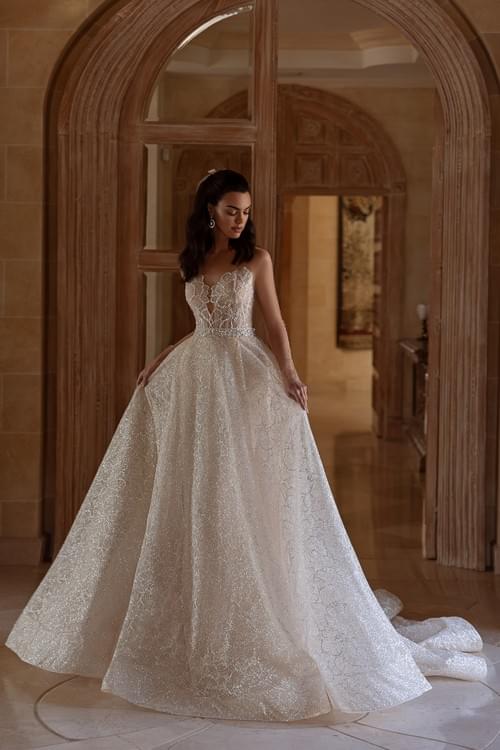 它採用性感的透視無肩帶緊身胸衣設計,並飾有精緻的珠寶圖案。