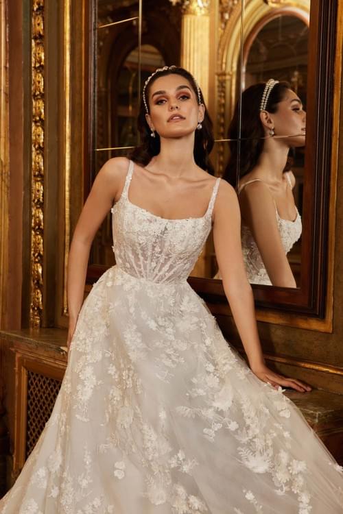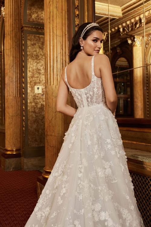全裙佈滿精緻的 3D 蕾絲貼花 與細微亮片,從胸前延伸至輕盈的裙襬,最受新娘喜愛的驚喜細節則是其實用的口袋設計,讓整件禮服在華麗中帶有一絲隨性自在。