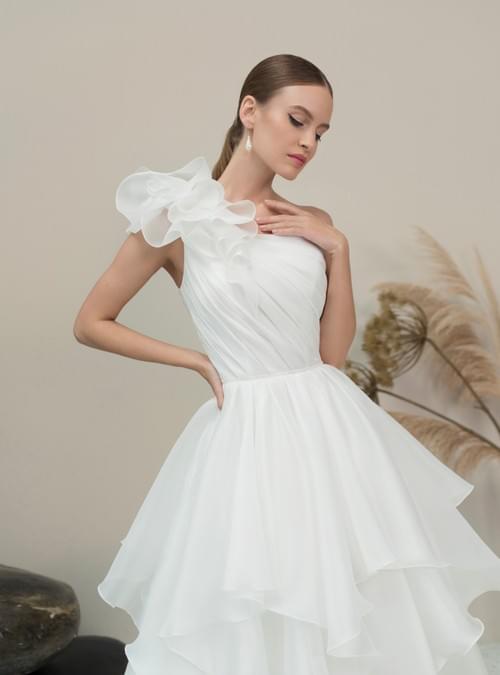 廓形與材質:採用經典的 A-line (A字型) 剪裁,選用輕盈飄逸的歐根紗 (Organza) 面料,營造出柔和且充滿仙氣的層次感。