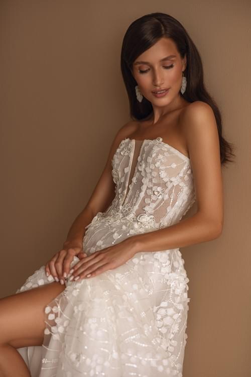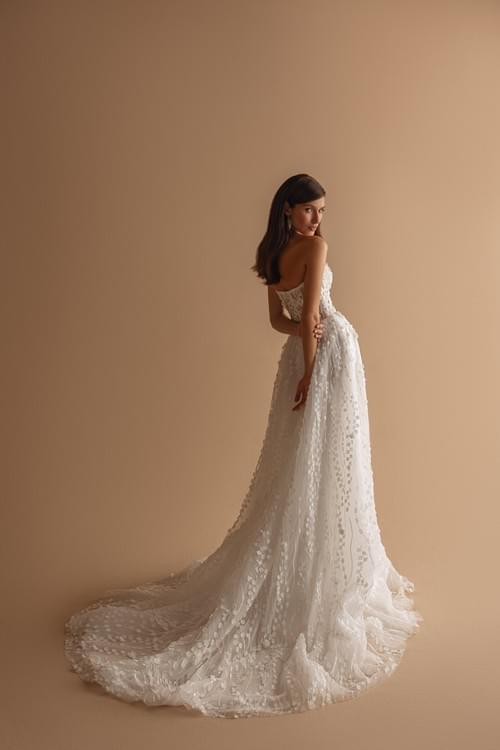 採用薄紗製成,上面飾有數千朵 3D 花卉貼花、精緻的蕾絲和亮片。