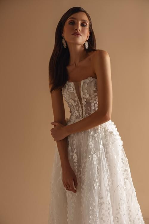 優雅的 A 字型輪廓,上身有深 V 領的緊身胸衣設計。