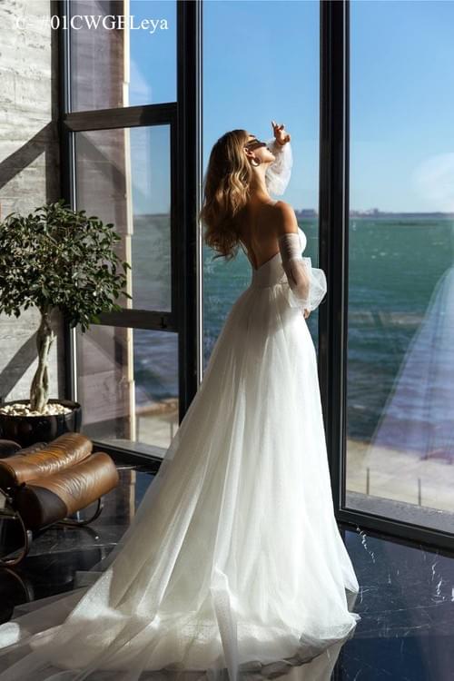 它最獨特的特點是配備了浪漫的可拆卸透明泡泡袖和層疊薄紗外罩裙,讓新娘可以在緊身美人魚裙和優雅的A字形婚紗之間輕鬆切換造型,適合儀式和招待會的不同需求。