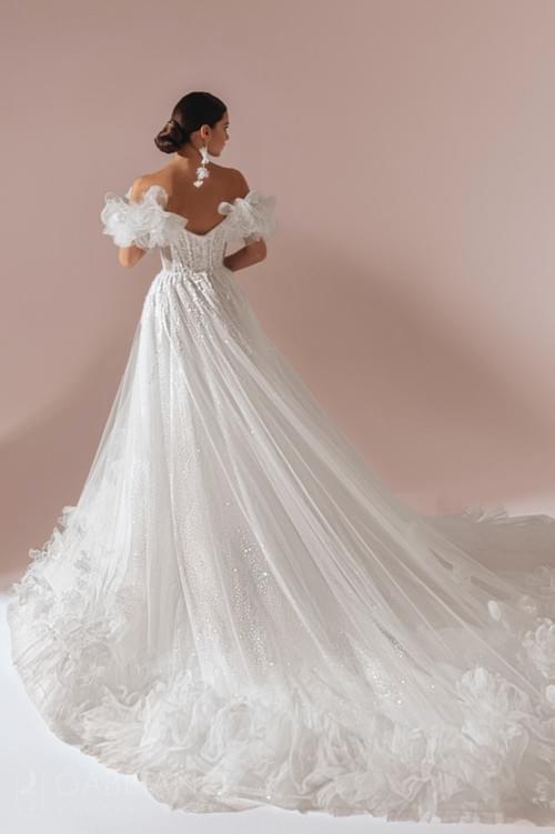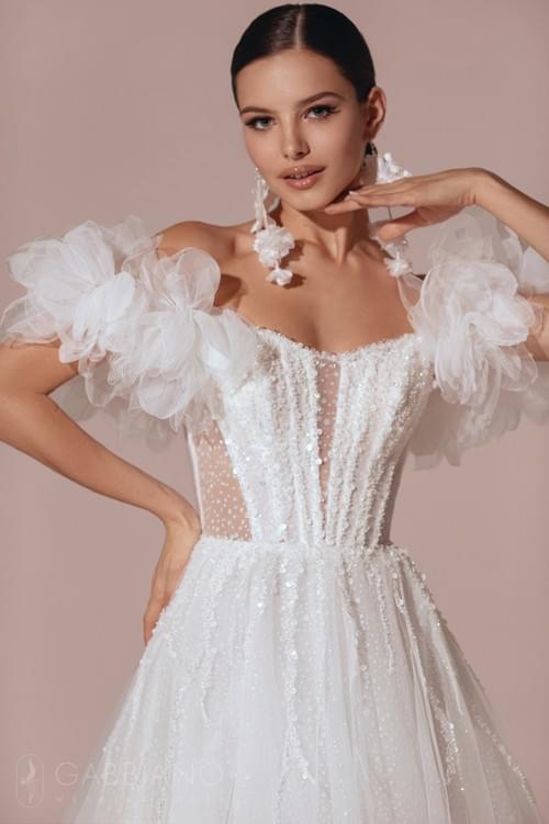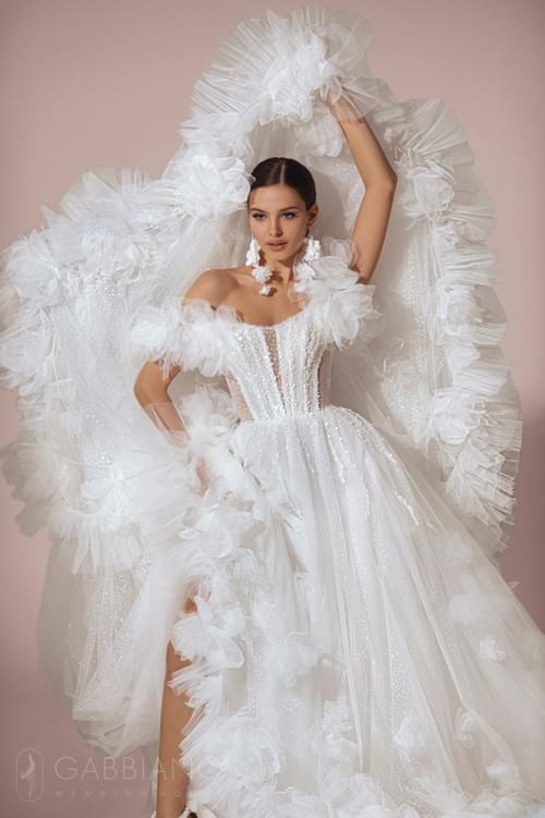 Gabbiano「洛弗蘭 (Lofran)」婚紗的設計特色是其半透明的緊身胸衣,上面裝飾著精緻的貼花和閃閃發光的亮片,並配有戲劇性的露肩分層荷葉邊和體積龐大的多層薄紗裙身。