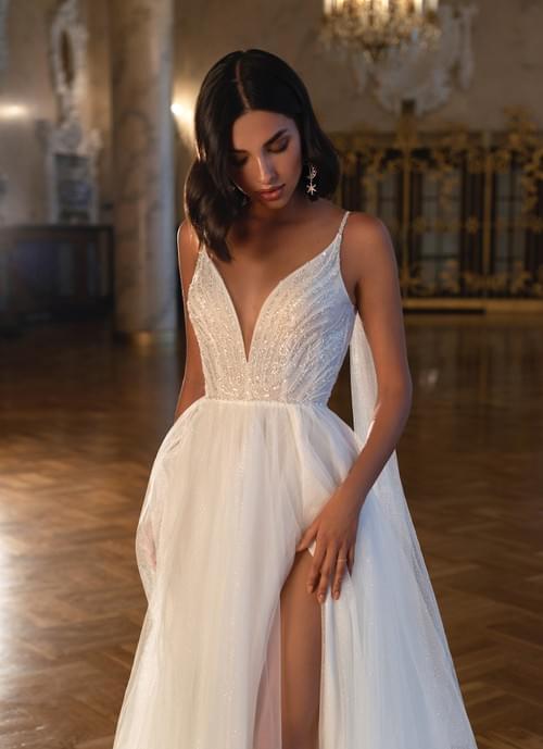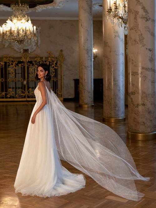 它由薄紗和蕾絲製成,具有獨特、性感且壯觀的設計,非常適合想要引人注目的新娘。