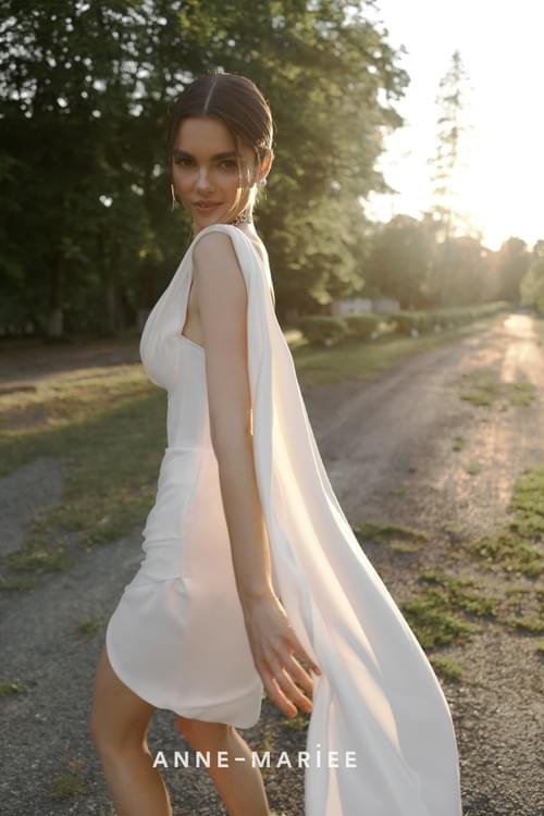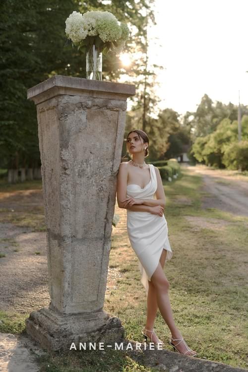 Anne-Mariee 品牌的「Luna」款式,設計為修身的露肩迷你裙,採用柔滑有彈性的緞面材質製成。
