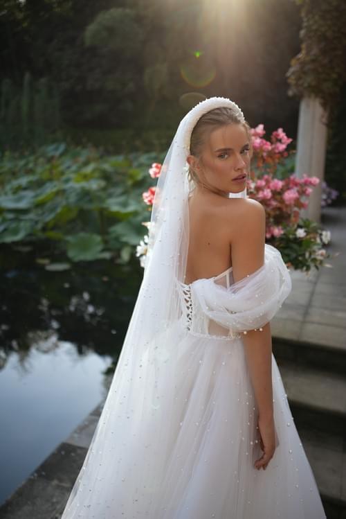 其設計亮點包括從胸衣延伸到裙擺的全件珍珠裝飾,營造出公主般的夢幻效果。